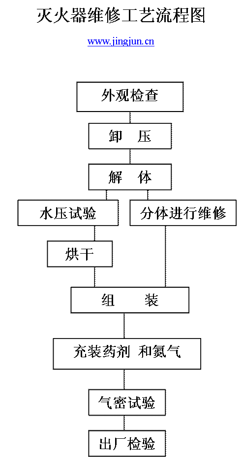 外觀檢查--卸壓--解體--水壓試驗(yàn)--分體進(jìn)行維修--筒體烘干--組裝--充裝藥劑、氮?dú)?SPAN lang=EN-US>--氣密試驗(yàn)--出廠檢驗(yàn);維修滅火器(年檢)包括: 1,滅火器檢測(cè)(卸壓打開(kāi)滅火器檢測(cè)器頭、閥門(mén)、虹吸管、壓力表性能是否正常,并更換損壞的配件);2,滅火器筒體水壓試驗(yàn),測(cè)試滅火器筒體在2.5MP的壓力下是否變形報(bào)廢,檢測(cè)滅火器筒體是否銹化腐蝕;3,烘干滅火器筒體;4,重新灌裝滅火藥劑并稱重計(jì)量,更換變質(zhì)的滅火藥劑;5,重新充裝驅(qū)動(dòng)氣體氮?dú)鈮海?/SPAN>6,密封器頭后做噴射性能檢查、氣密性能檢查;7,滅火器筒體外部的清潔清洗;8,貼當(dāng)?shù)叵谰终J(rèn)可的 滅火器維修年檢合格證 標(biāo)簽